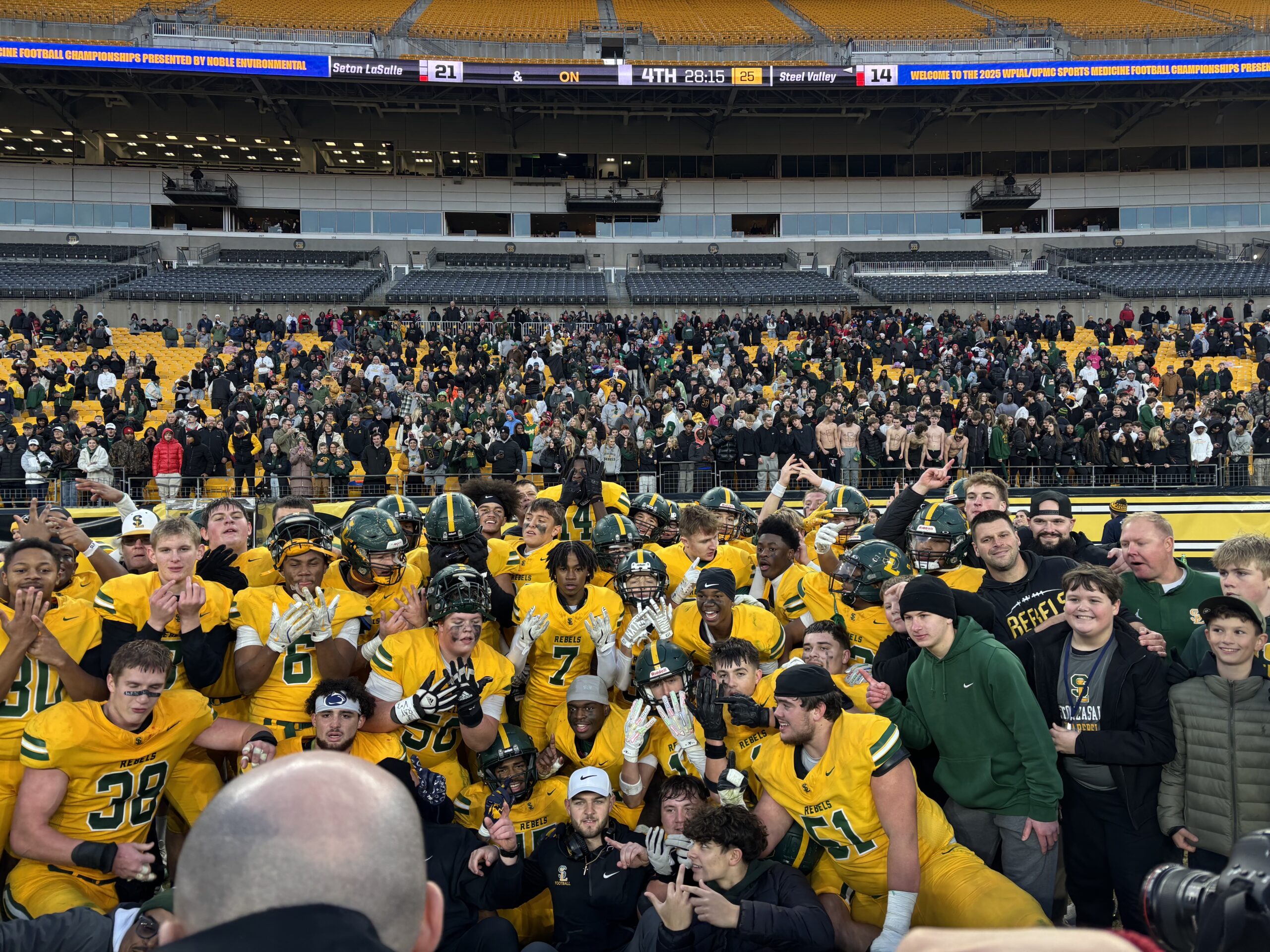 In a game that earned Seton LaSalle (12-1) a sixth WPIAL title, the Rebels stormed from behind to claim the win. After rallying from six points down at the half to beat Washington in the semifinals, the Rebels topped that by coming back from a 14-0 third-quarter deficit to topple Steel Valley (9-4), which was trying to win a seventh title and second in four years.
